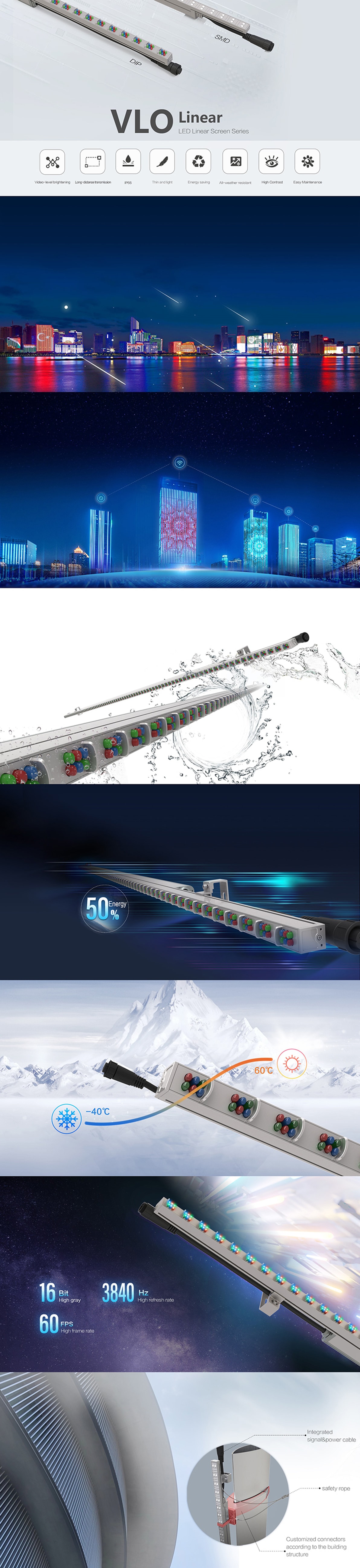 LED灯条屏(又称LED条形屏)是专为景观建筑照明设计的一款视频级亮化产品。全新自主研发设计,采用专业防水接头多级连接组合,能组成点、线、面各种形状显示图文视频画面。高度集成设计,外观简洁精美,具有轻、薄、户外防水、无钢结构、免散热设备、低功耗、集控化等特性,适用于构建超大型户外显示屏,是创建地标动态显示景观的首选。