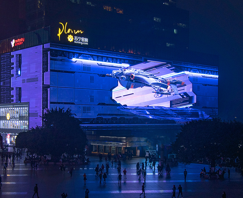 3.重庆观音桥裸眼3D屏案例,裸眼3D太空飞船炫酷体验,迅速上了热搜,还被央媒报道,可谓是重庆人的牌面。大视频大视觉,在观赏上具有赏心悦目的效果,每天来打卡的人超级多,有的甚至不远千里来打卡。